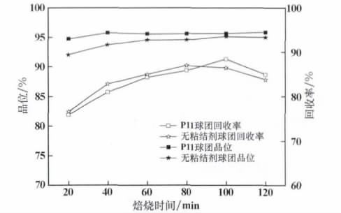 確定球團 P11 為優(yōu)選配方后,對其進行直接還原焙燒-磁選試驗。無粘結劑球團作為對照試驗,考察粘結劑對球團直接還原焙燒磁選的影響。從圖3 可以看出,兩種球團隨焙燒時間的變化趨勢基本一致,隨著焙燒時間的延長,直接還原鐵產(chǎn)品品位變化不大;回收率呈先升高后緩慢降低的趨勢。